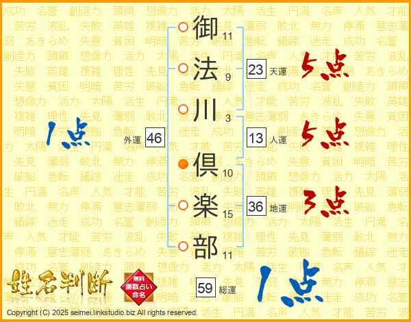 御法川倶楽部さんの人運は13画の5点!