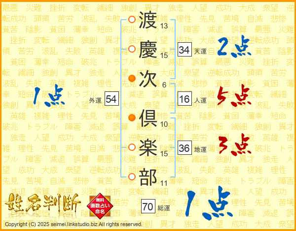 渡(13画)慶(15画)次(6画) 倶(10画)楽(15画)部(11画)