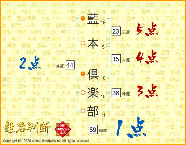藍(18画)本(5画) 倶(10画)楽(15画)部(11画)