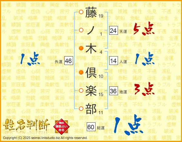 藤(19画)ノ(1画)木(4画) 倶(10画)楽(15画)部(11画)