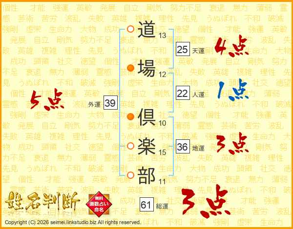 道(13画)場(12画) 倶(10画)楽(15画)部(11画)