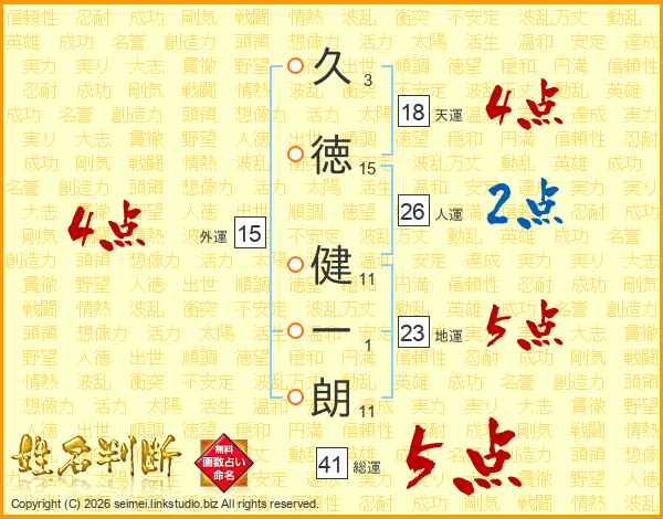 久(3画)徳(15画) 健(11画)一(1画)朗(11画)