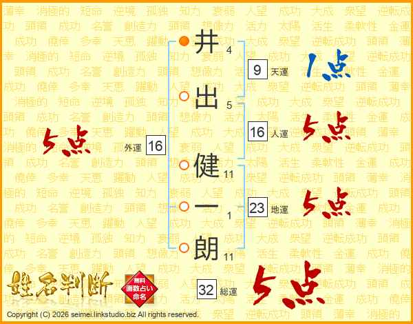 井(4画)出(5画) 健(11画)一(1画)朗(11画)