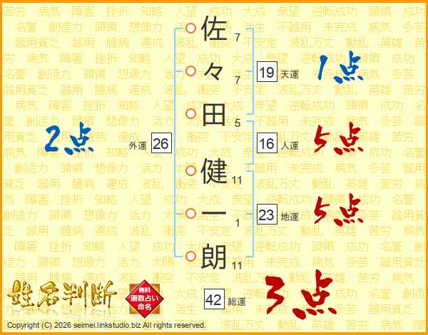 佐(7画)々(7画)田(5画) 健(11画)一(1画)朗(11画)
