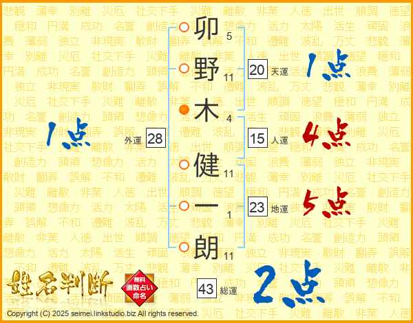 卯(5画)野(11画)木(4画) 健(11画)一(1画)朗(11画)