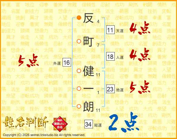 反(4画)町(7画) 健(11画)一(1画)朗(11画)