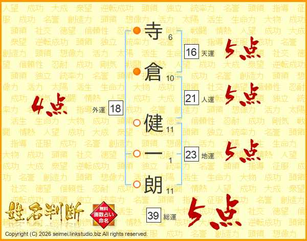 寺(6画)倉(10画) 健(11画)一(1画)朗(11画)