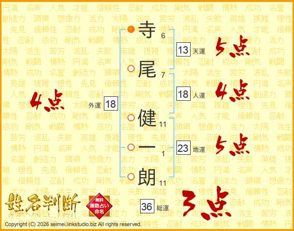 寺(6画)尾(7画) 健(11画)一(1画)朗(11画)