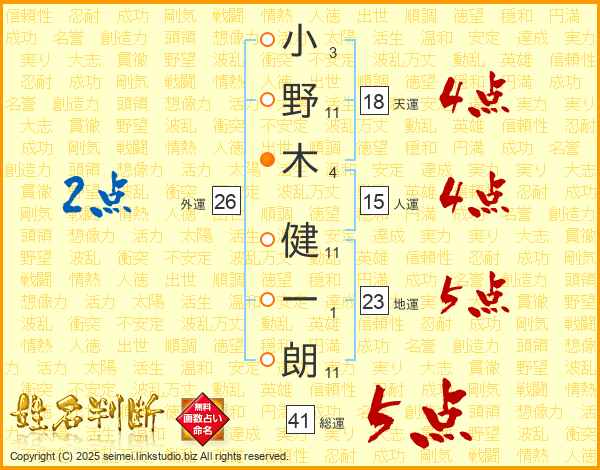 小(3画)野(11画)木(4画) 健(11画)一(1画)朗(11画)