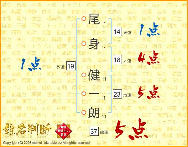 尾(7画)身(7画) 健(11画)一(1画)朗(11画)