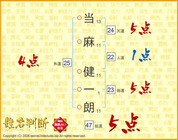 当(13画)麻(11画) 健(11画)一(1画)朗(11画)