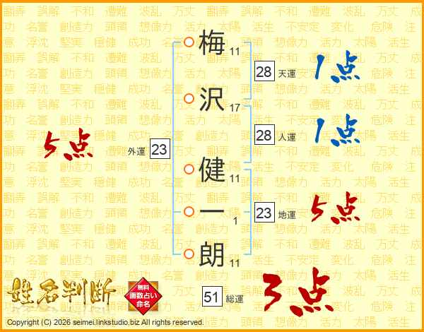 梅(11画)沢(17画) 健(11画)一(1画)朗(11画)