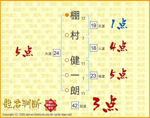 棚(12画)村(7画) 健(11画)一(1画)朗(11画)