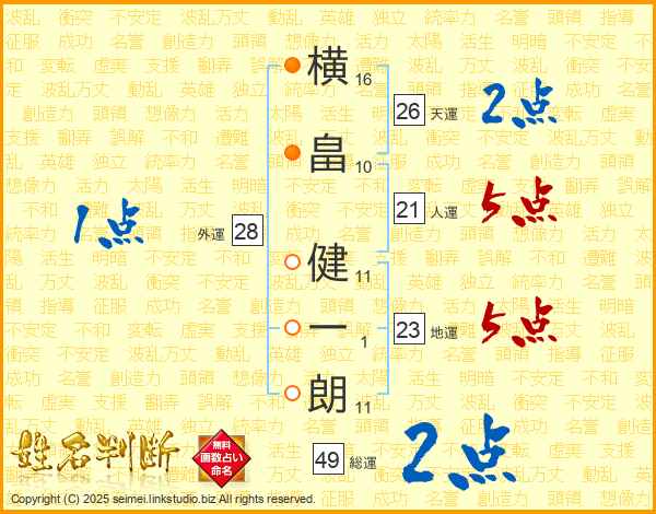 横(16画)畠(10画) 健(11画)一(1画)朗(11画)
