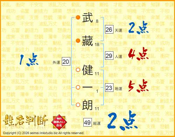 武(8画)藏(18画) 健(11画)一(1画)朗(11画)