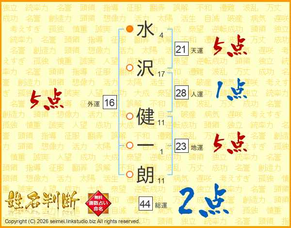 水(4画)沢(17画) 健(11画)一(1画)朗(11画)