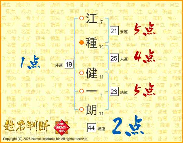 江(7画)種(14画) 健(11画)一(1画)朗(11画)
