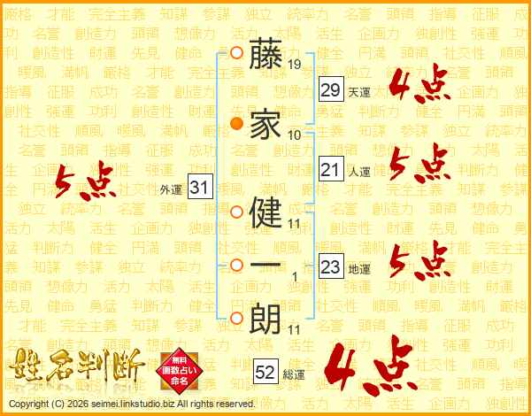 藤(19画)家(10画) 健(11画)一(1画)朗(11画)