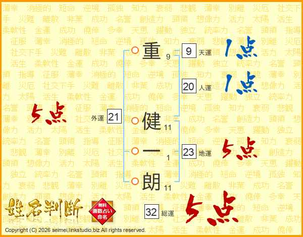 あなたの人生を表す1番重要な運勢です。生涯を通じて影響する総合運となり、主に50歳以降の晩年期に影響を及ぼします。苗字と名前の合計画数。