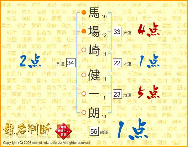 馬(10画)場(12画)崎(11画) 健(11画)一(1画)朗(11画)