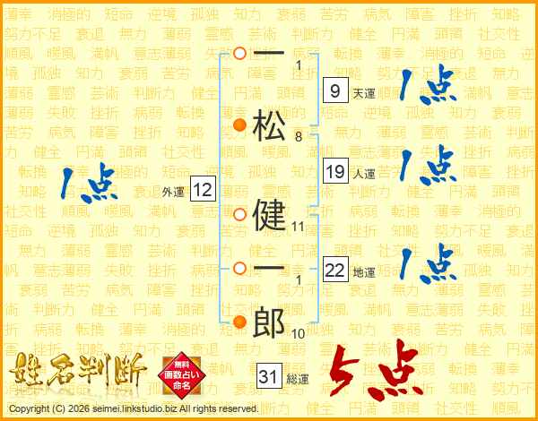 一(1画)松(8画) 健(11画)一(1画)郎(10画)
