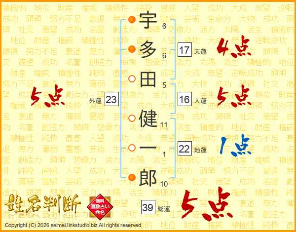 宇(6画)多(6画)田(5画) 健(11画)一(1画)郎(10画)