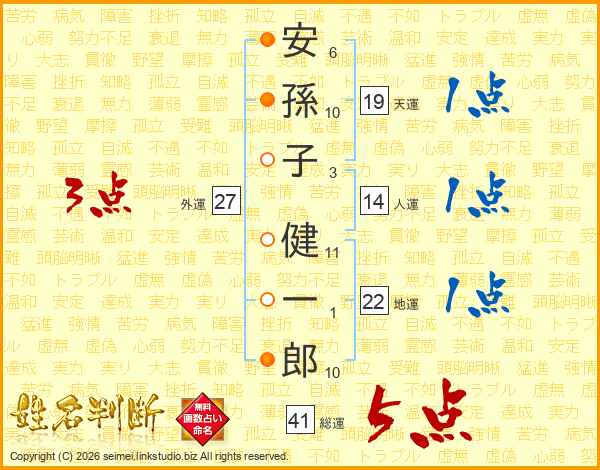 安(6画)孫(10画)子(3画) 健(11画)一(1画)郎(10画)