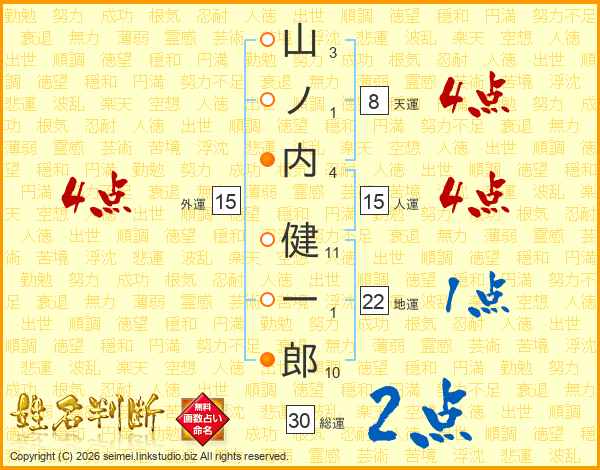 山(3画)ノ(1画)内(4画) 健(11画)一(1画)郎(10画)