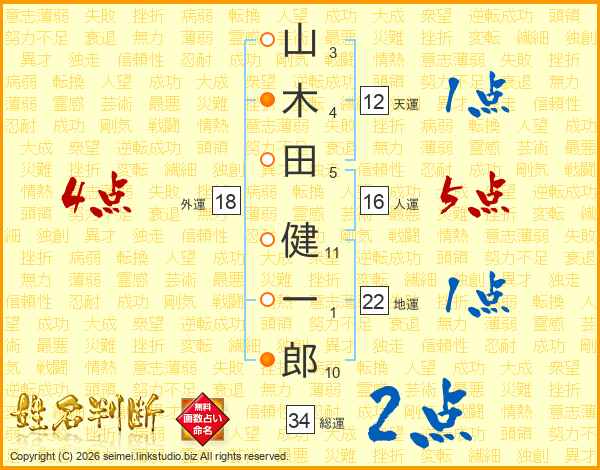 あなたの人生を表す1番重要な運勢です。生涯を通じて影響する総合運となり、主に50歳以降の晩年期に影響を及ぼします。苗字と名前の合計画数。