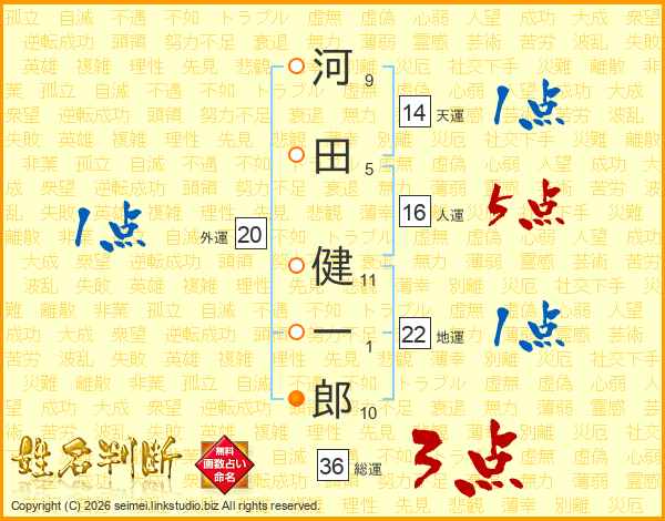 河(9画)田(5画) 健(11画)一(1画)郎(10画)