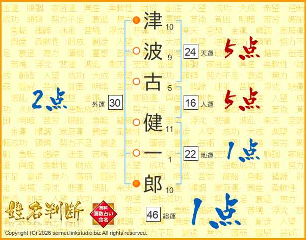 津(10画)波(9画)古(5画) 健(11画)一(1画)郎(10画)