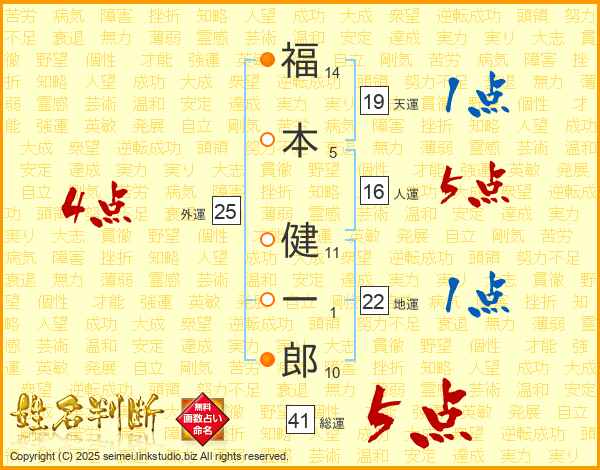 福(14画)本(5画) 健(11画)一(1画)郎(10画)