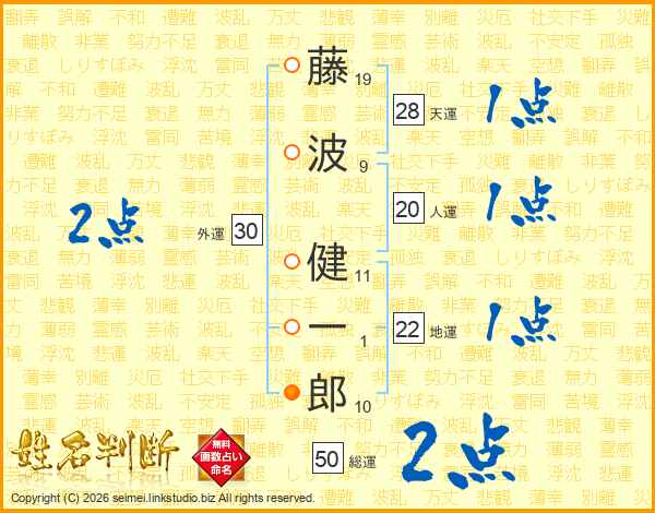 藤(19画)波(9画) 健(11画)一(1画)郎(10画)