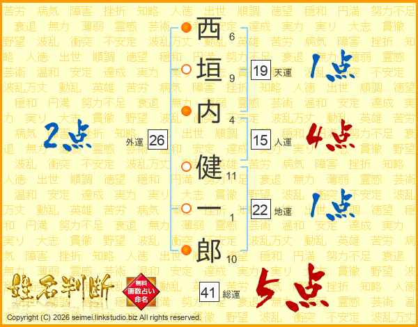 西(6画)垣(9画)内(4画) 健(11画)一(1画)郎(10画)