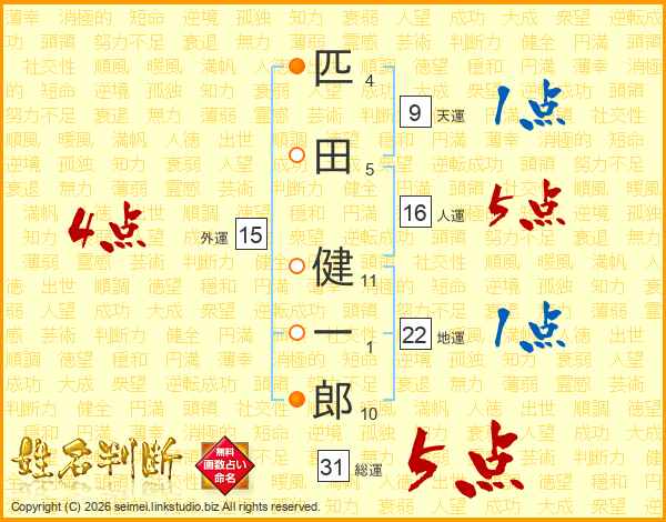匹(4画)田(5画) 健(11画)一(1画)郎(10画)