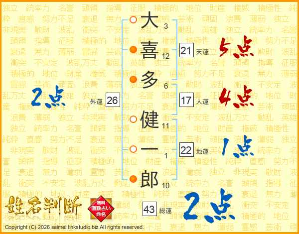 大(3画)喜(12画)多(6画) 健(11画)一(1画)郎(10画)