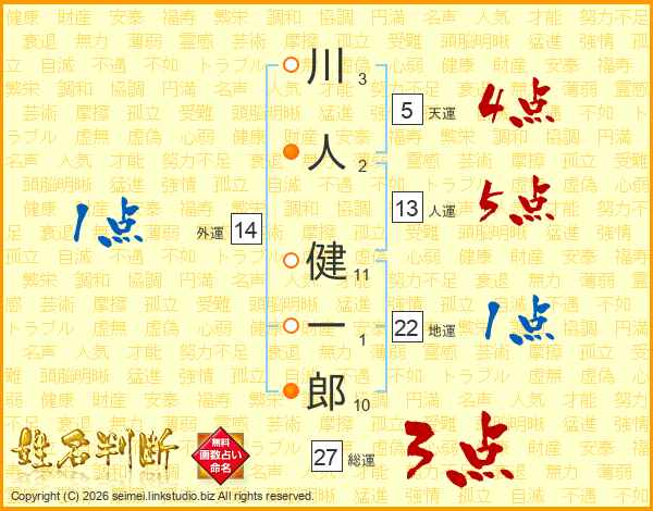 川(3画)人(2画) 健(11画)一(1画)郎(10画)