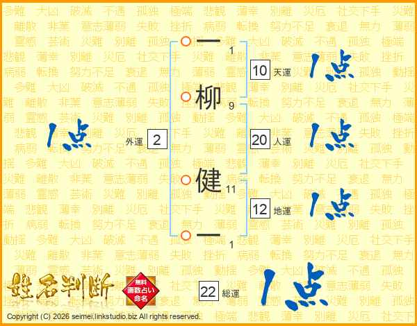 生活面を象徴する運勢です。外部から受ける影響力を表し、結婚運、家庭運や職場、環境への順応性を表します。総運から人運を引いた画数。姓や名が1文字の場合を除く。