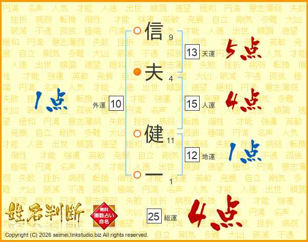 信(9画)夫(4画) 健(11画)一(1画)