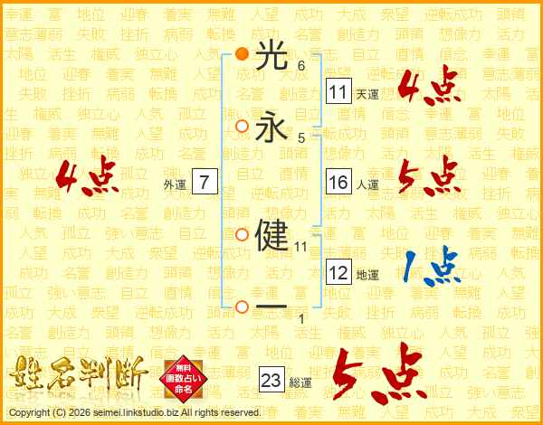 あなたの人生を表す1番重要な運勢です。生涯を通じて影響する総合運となり、主に50歳以降の晩年期に影響を及ぼします。苗字と名前の合計画数。