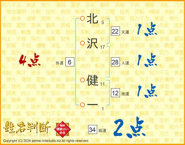 あなたの人生を表す1番重要な運勢です。生涯を通じて影響する総合運となり、主に50歳以降の晩年期に影響を及ぼします。苗字と名前の合計画数。