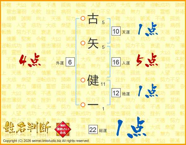 家系が持つ宿命的な運勢を表します。祖先から受け継いだ苗字ですので自分の力が及びません。家柄を象徴します。苗字の合計画数。