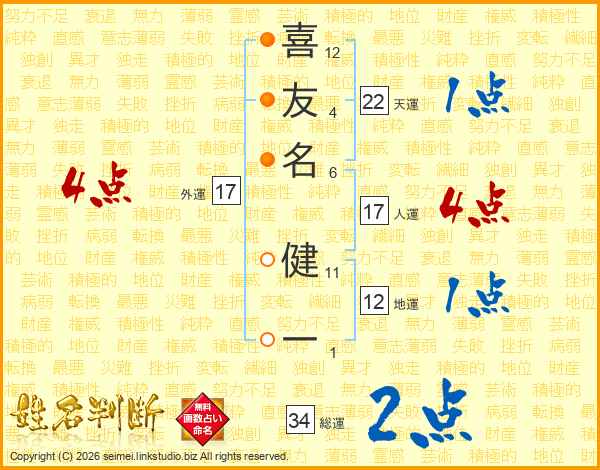 喜(12画)友(4画)名(6画) 健(11画)一(1画)