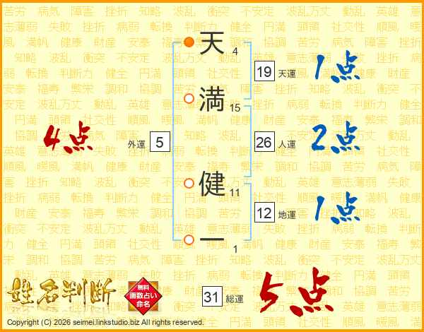 天(4画)満(15画) 健(11画)一(1画)