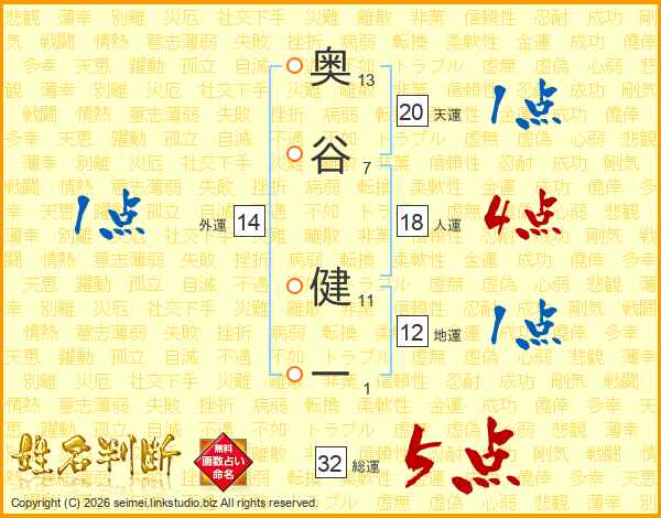 生活面を象徴する運勢です。外部から受ける影響力を表し、結婚運、家庭運や職場、環境への順応性を表します。総運から人運を引いた画数。姓や名が1文字の場合を除く。
