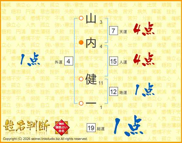 生活面を象徴する運勢です。外部から受ける影響力を表し、結婚運、家庭運や職場、環境への順応性を表します。総運から人運を引いた画数。姓や名が1文字の場合を除く。