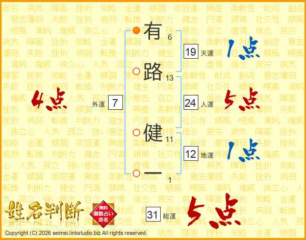 有路健一さんの総運は31画の5点!