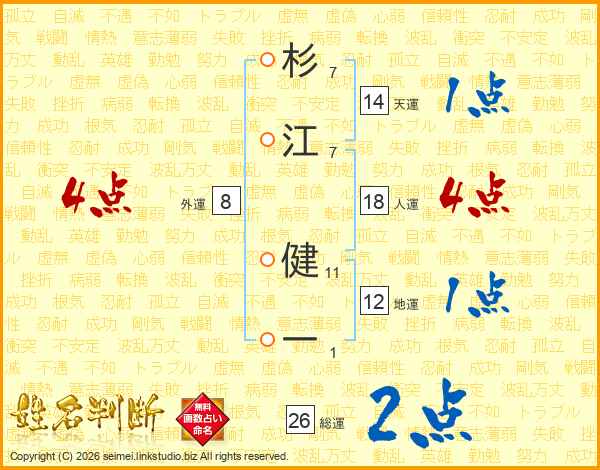 杉(7画)江(7画) 健(11画)一(1画)