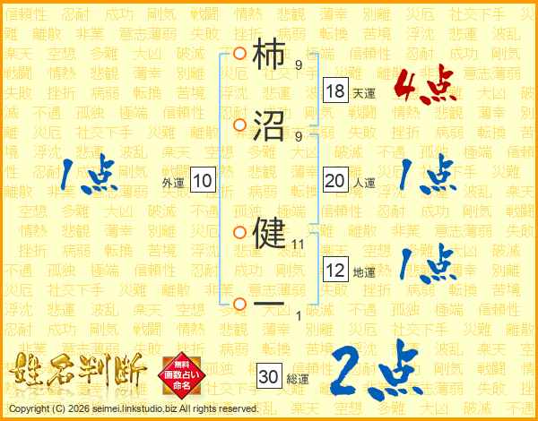 生活面を象徴する運勢です。外部から受ける影響力を表し、結婚運、家庭運や職場、環境への順応性を表します。総運から人運を引いた画数。姓や名が1文字の場合を除く。