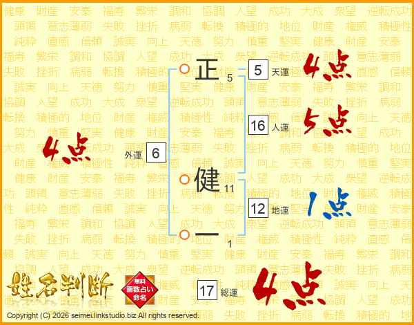 あなたの人生を表す1番重要な運勢です。生涯を通じて影響する総合運となり、主に50歳以降の晩年期に影響を及ぼします。苗字と名前の合計画数。